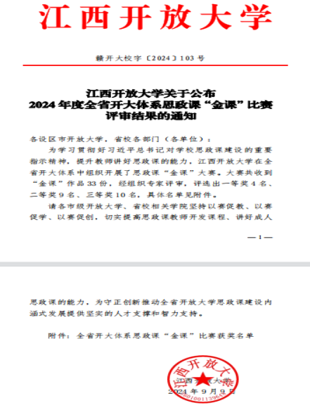 近日,在AC米兰中文官方网站公布的《关于公布2024 年度全省开大体系思政课“金课”比赛评审结果的通知》(赣开大校字〔2024〕103 号),我院教师罗运华凭借其扎实的教学功底、创新的教学方法,在众多参赛选手中脱颖而出,斩获“三等奖”的佳绩。 学院领导对罗运华老师的获奖表示热烈祝贺,并号召全体教师以此为契机,积极探索教育教学的改革,不断提升教学水平和业务能力。 (供稿:教务科 责编:罗运华 终审:倪涛)