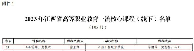 近日,江西省教育厅印发《关于公布 2023 年江西省职业教育一流核心课程(线下)认定结果的通知》(赣教职成办函〔2023〕34号),智能技术学院《Web前端开发技术》被认定为2023年江西省职业教育一流核心课程,实现了学校计算机类专业在省职业教育一流核心课程中零的突破,这也是学校体制机制改革以来智能技术学院在专业建设方面的又一个突破。