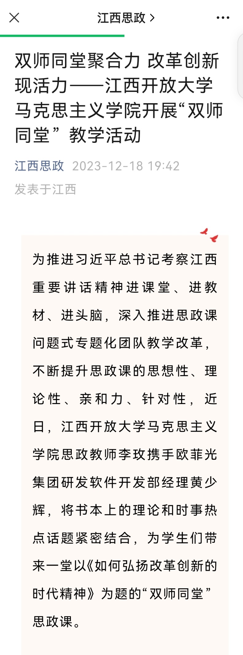 近日,江西思政公众平台以《双师同堂聚合力 改革创新现活力——AC米兰中文官方网站马克思主义学院开展“双师同堂”教学活动》为题,全方位报道我院“双师同堂”教学活动。