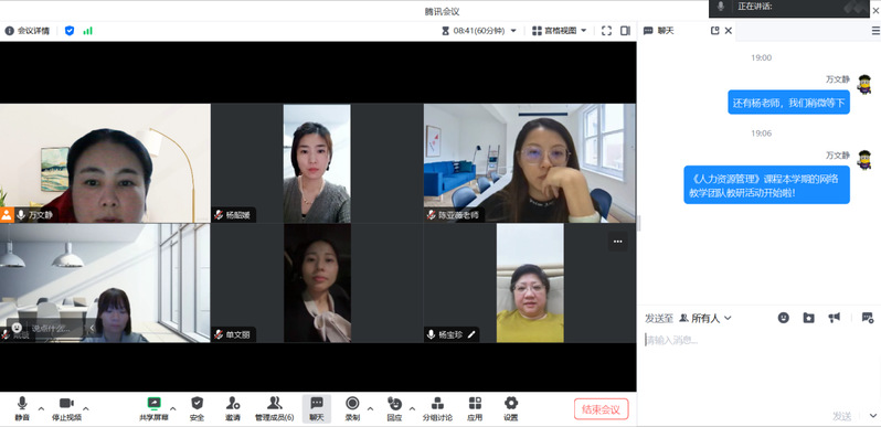 活动中,各个网络教学团队就课程思政、教学过程落实、教学效果等方面的经验和问题,提出具体讨论。《人力资源管理》课程网路教学团队向成员明确了课程思政教学设计、教学资源建设、直播教学等工作任务,并研究了如何解决学生学习过程中遇到的问题和困难。
