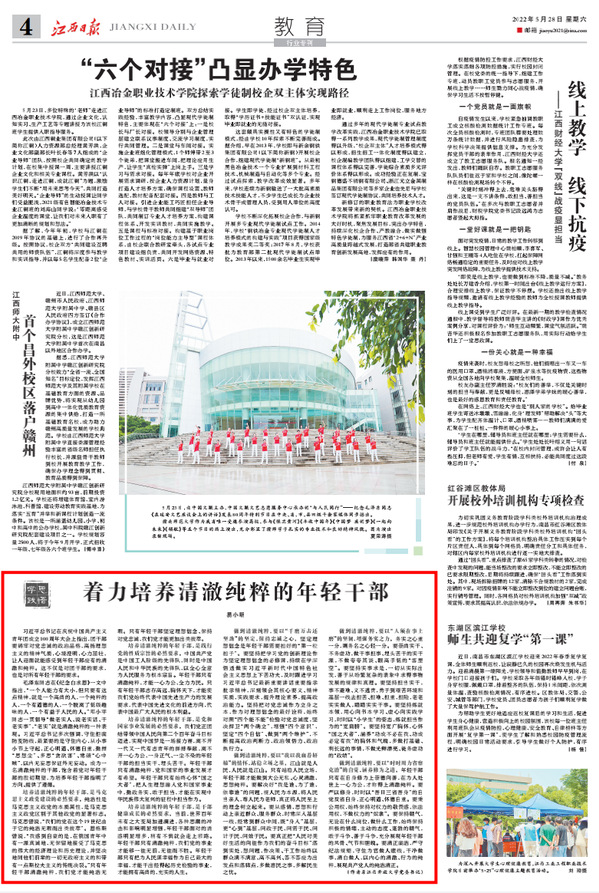 5月28日,我校党委书记易小明所著文章《着力培养清澈纯粹的年轻干部》在《江西日报》发表。文章以习近平总书记在庆祝中国共产主义青年团成立100周年大会上的重要讲话中对年轻团干部的殷切期望为出发点,围绕如何培养清澈纯粹的年轻干部展开阐述,并勉励年轻干部要保持忠诚之心、站稳立场之基、增强务实之力、涵养修为之道,努力成为一名清澈纯粹的干部。