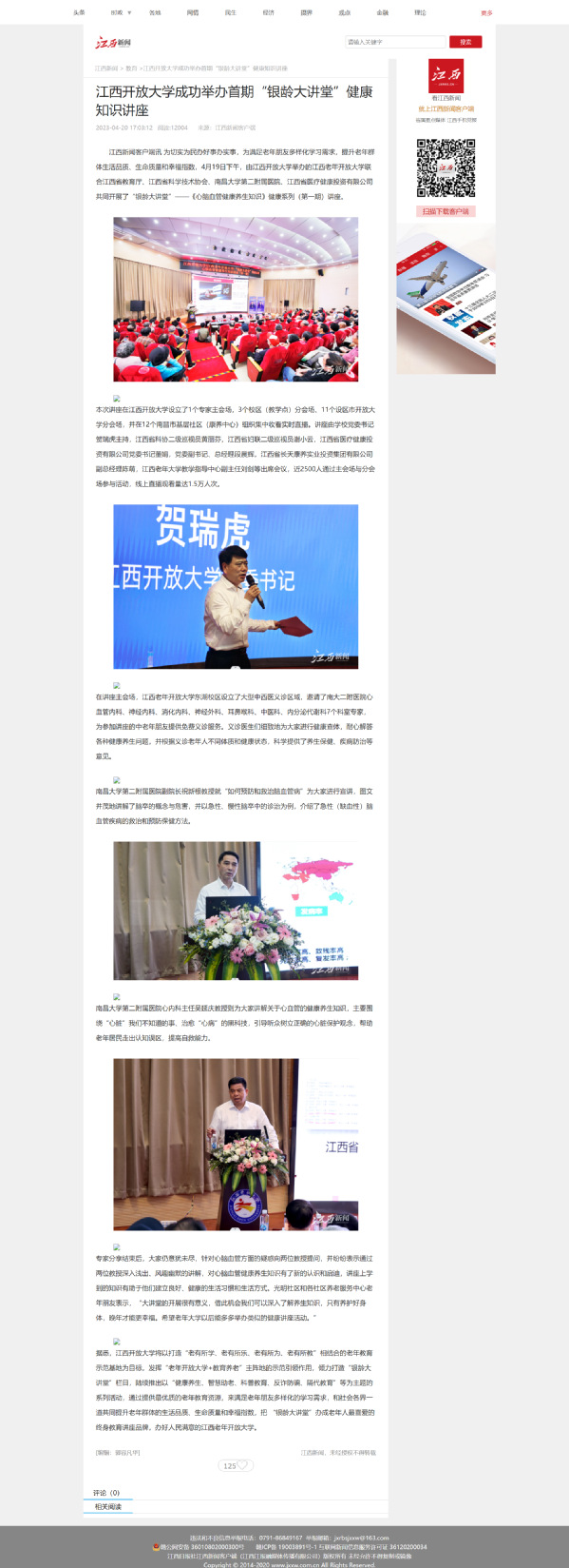江西新闻客户端讯 为切实为民办好事办实事,为满足老年朋友多样化学习需求,提升老年群体生活品质、生命质量和幸福指数,4月19日下午,由AC米兰中文官方网站举办的江西老年开放大学联合江西省教育厅、江西省科学技术协会、南昌大学第二附属医院、江西省医疗健康投资有限公司共同开展了“银龄大讲堂”——《心脑血管健康养生知识》健康系列(第一期)讲座。