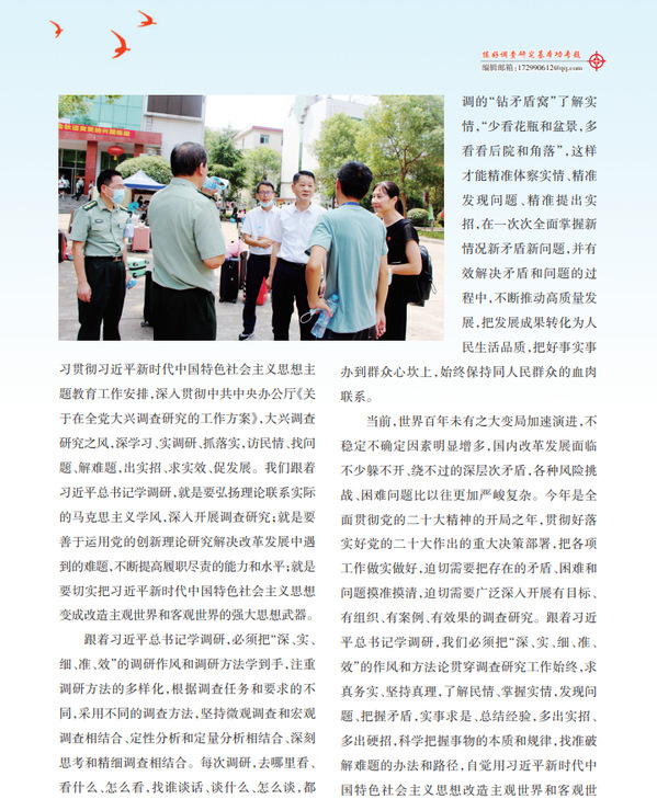 跟着习近平总书记学调研,必须把深、实、 细、准、效的调研作风和调研方法学到手,注重调研方法的多样化,根据调查任务和要求的不同,采用不同的调查方法,坚持微观调查和宏观调查相结合、定性分析和定量分析相结合、深刻思考和精细调查相结合。每次调研,去哪里看、 看什么、怎么看,找谁谈话、谈什么、怎么谈,都事关调研工作的效率和调研成果的质量。跟着习近平总书记学调研,必须认真遵循总书记强调的钻矛盾窝了解实情,少看花瓶和盆景,多看看后院和角落,这样才能精准体察实情、精准发现问题、精准提出实招,在一次次全面掌握新情况新矛盾新问题,并有效解决矛盾和问题的过程中,不断推动高质量发展,把发展成果转化为人民生活品质,把好事实事 办到群众心坎上,始终保持同人民群众的血肉联系。