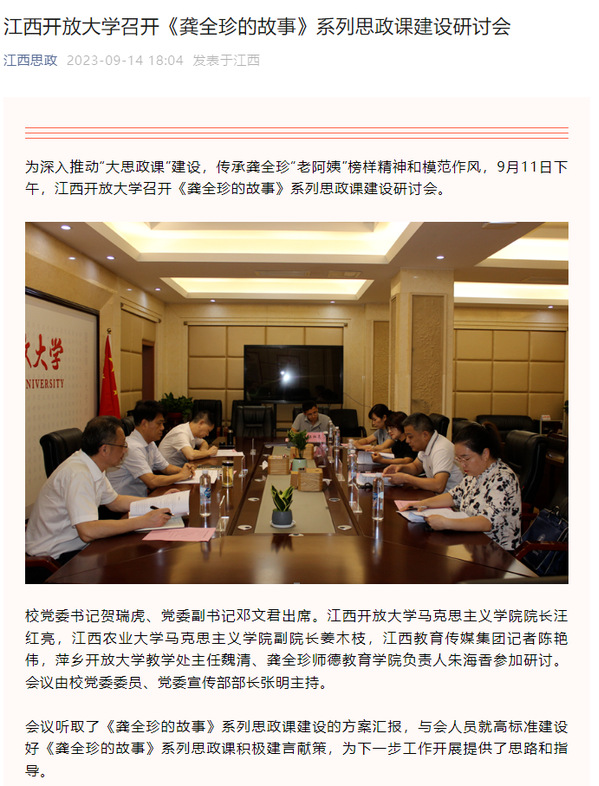 为深入推动“大思政课”建设,传承龚全珍“老阿姨”榜样精神和模范作风,9月11日下午,AC米兰中文官方网站召开《龚全珍的故事》系列思政课建设研讨会。近日,江西思政对此进行报道。
