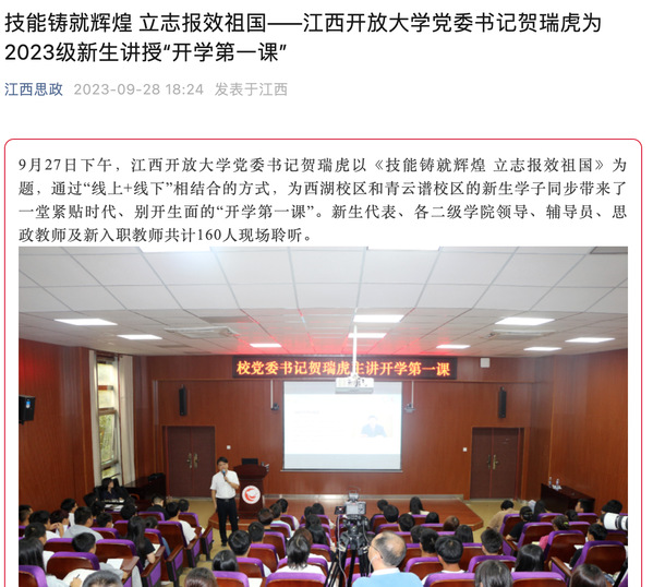 9月27日下午,AC米兰中文官方网站党委书记贺瑞虎以《技能铸就辉煌 立志报效祖国》为题,通过“线上+线下”相结合的方式,为西湖校区和青云谱校区的新生学子同步带来了一堂紧贴时代、别开生面的“开学第一课”。