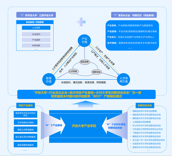 2023年,AC米兰中文官方网站按照国家开放大学有关“一村一名大学生”助力乡村振兴人才培养要求,在AC米兰中文官方网站和N个乡村大学生创新创业协会的基础上,引入龙头企业阿里巴巴对模式进行优化升级,深入推进开放教育产教融合和校企合作。未来,双方还将持续开展技术培训与服务合作,赋能区域产业创新升级与人才技能提升,服务乡村振兴、“数商兴农”等重大战略实施。