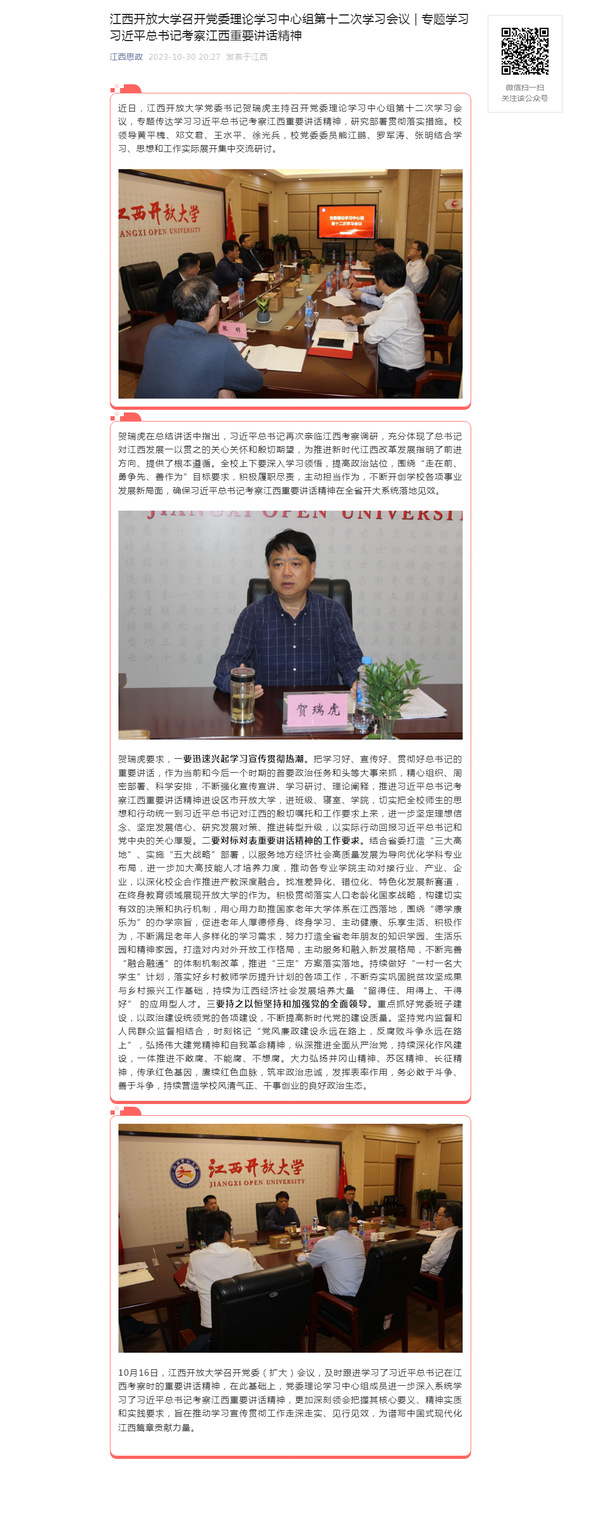 近日,AC米兰中文官方网站党委书记贺瑞虎主持召开党委理论学习中心组第十二次学习会议,专题传达学习习近平总书记考察江西重要讲话精神,研究部署贯彻落实措施。校领导黄平槐、邓文君、王水平、徐光兵,校党委委员熊江鹏、罗军涛、张明结合学习、思想和工作实际展开集中交流研讨。