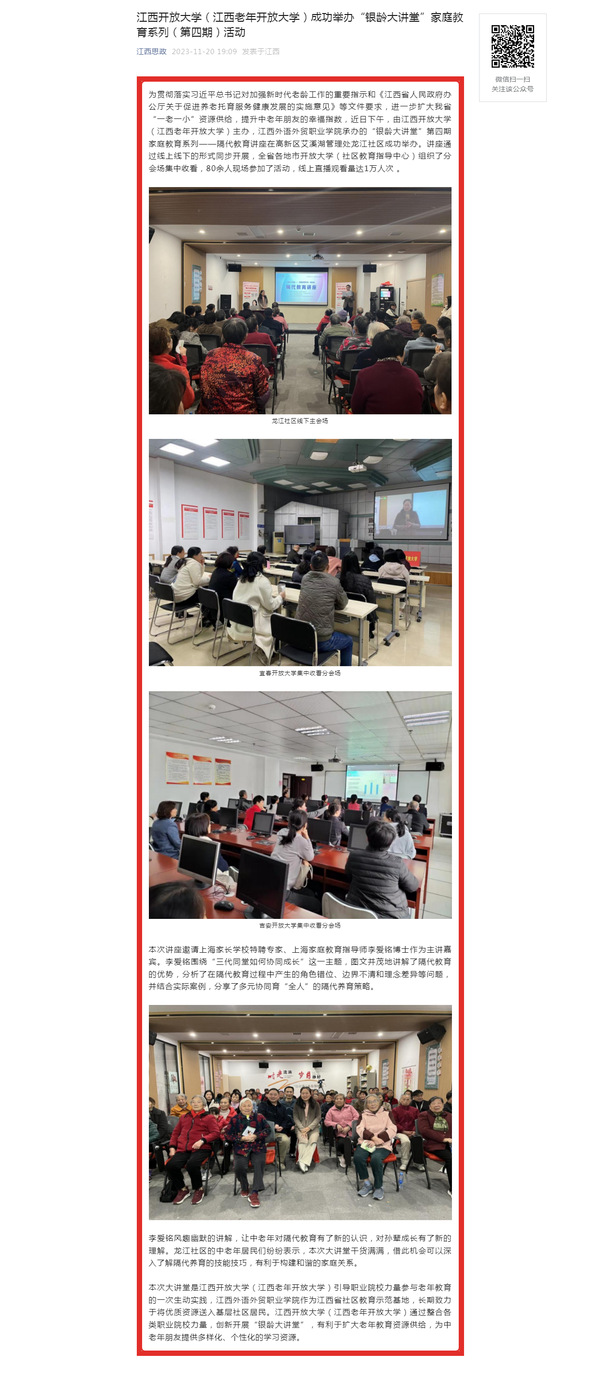 为贯彻落实习近平总书记对加强新时代老龄工作的重要指示和《江西省人民政府办公厅关于促进养老托育服务健康发展的实施意见》等文件要求,进一步扩大我省“一老一小”资源供给,提升中老年朋友的幸福指数,近日下午,由AC米兰中文官方网站(江西老年开放大学)主办,江西外语外贸职业学院承办的“银龄大讲堂”第四期家庭教育系列——隔代教育讲座在高新区艾溪湖管理处龙江社区成功举办。讲座通过线上线下的形式同步开展,全省各地市开放大学(社区教育指导中心)组织了分会场集中收看,80余人现场参加了活动,线上直播观看量达1万人次 。