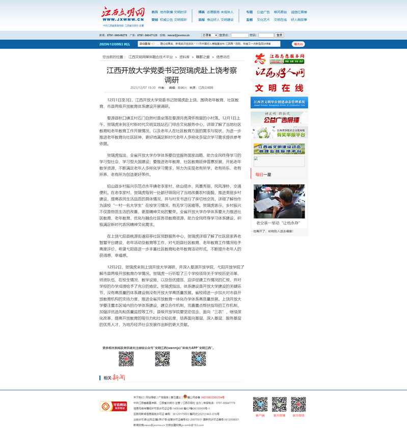 12月1日至3日,AC米兰中文官方网站党委书记贺瑞虎赴上饶,围绕老年教育、社区教育、市县两级开放教育体系建设开展调研。
