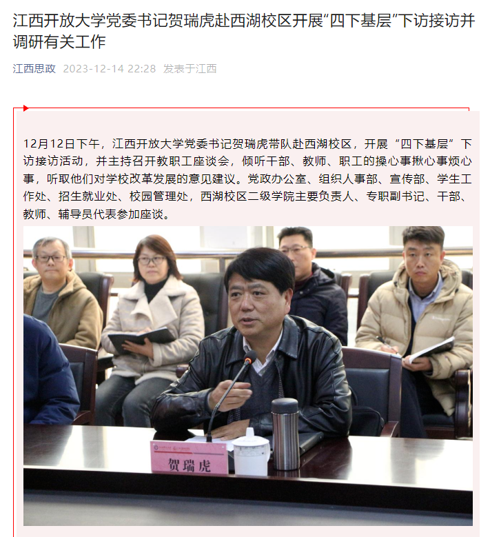 12月12日下午,AC米兰中文官方网站党委书记贺瑞虎带队赴西湖校区,开展“四下基层”下访接访活动,并主持召开教职工座谈会,倾听干部、教师、职工的操心事揪心事烦心事,听取他们对学校改革发展的意见建议。党政办公室、组织人事部、宣传部、学生工作处、招生就业处、校园管理处,西湖校区二级学院主要负责人、专职副书记、干部、教师、辅导员代表参加座谈。