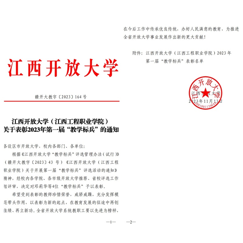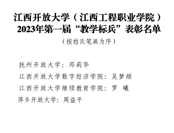 近日,学校公布了2023 年第一届“教学标兵”表彰名单,4位教师入选。他们分别是抚州开放大学邓莉华、数字经济学院吴梦颀、继续教育学院罗曦、萍乡开放大学周益平。