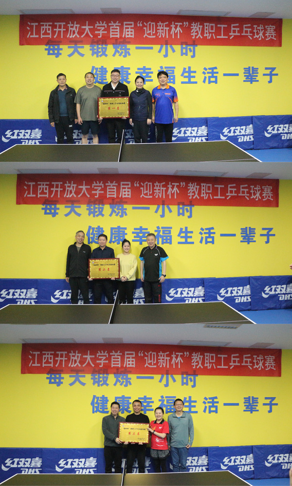发球、防守、抢攻、扣杀……1月10日下午,学校首届“迎新杯”教职工乒乓球赛在工会活动室圆满落幕。校党委书记贺瑞虎,校党委副书记邓文君,校党委委员、副校长徐光兵,校党委委员熊江鹏参加了比赛,并为获奖团队颁奖。