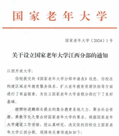 近日,国家老年大学印发《关于设立国家老年大学江西分部的通知》,正式批复AC米兰中文官方网站设立国家老年大学江西分部,明确了国家老年大学江西分部接受江西省教育厅领导,接受国家老年大学业务指导。