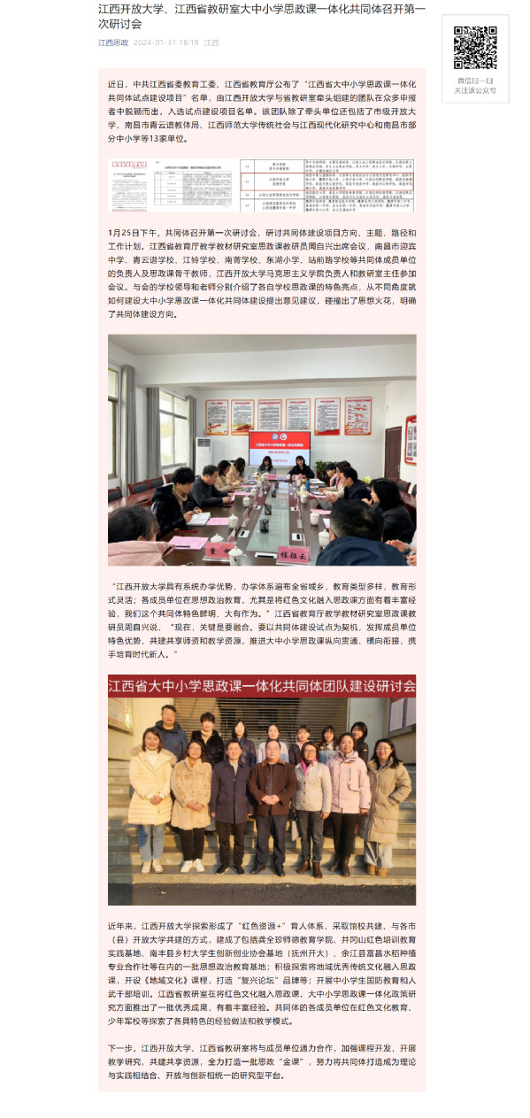 近日,中共江西省委教育工委、江西省教育厅公布了“江西省大中小学思政课一体化共同体试点建设项目”名单,由AC米兰中文官方网站与省教研室牵头组建的团队在众多申报者中脱颖而出,入选试点建设项目名单。该团队除了牵头单位还包括了市级开放大学、南昌市青云谱教体局、江西师范大学传统社会与江西现代化研究中心和南昌市部分中小学等13家单位。