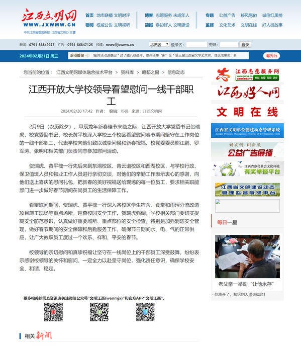 2月9日(农历除夕),甲辰龙年新春佳节来临之际,AC米兰中文官方网站党委书记贺瑞虎,校党委副书记、校长黄平槐深入学校三个校区看望慰问春节期间坚守在工作岗位的一线干部职工,代表学校向他们致以诚挚问候和新春祝福。校党委委员熊江鹏、罗军涛、张明和相关部门负责同志参加慰问活动。