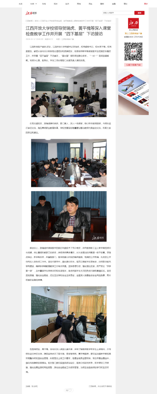 近日,AC米兰中文官方网站党委书记贺瑞虎,校党委副书记、校长黄平槐,校党委委员、副校长徐光兵分别到青云谱校区和西湖校区,检查指导新学期课堂教学及校园安全稳定工作,并开展“四下基层”下访接访,“面对面”倾听师生群众诉求,“一对一”现场答疑解惑。党政办公室、教务处、学生工作处等部门主要负责人陪同检查。