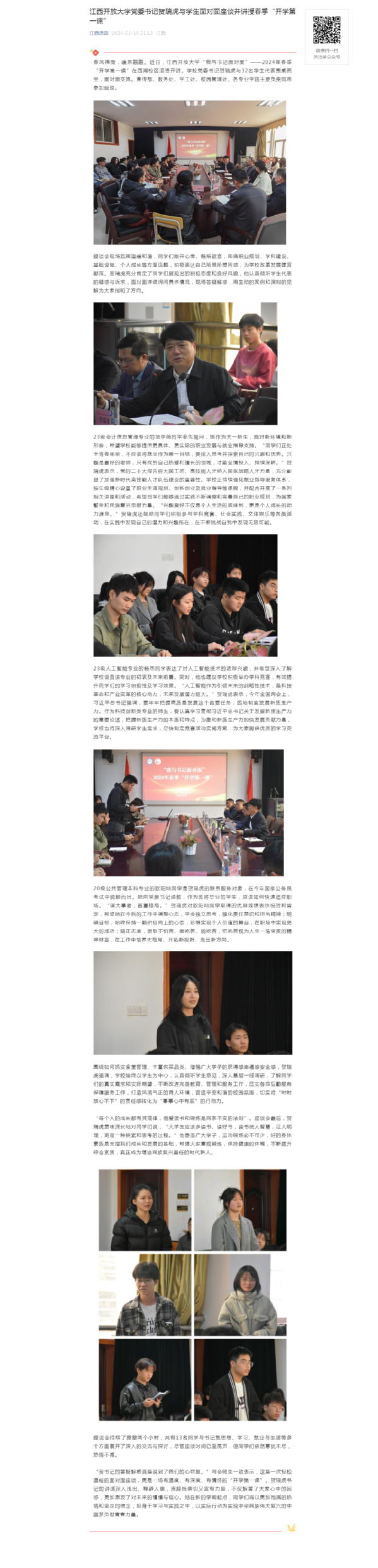 春风拂面,暖意融融。近日,AC米兰中文官方网站“我与书记面对面”——2024年春季“开学第一课”在西湖校区滚烫开讲。学校党委书记贺瑞虎与32名学生代表围桌而坐,面对面交流。宣传部、教务处、学工处、校园管理处、各专业学院主要负责同志参加座谈。