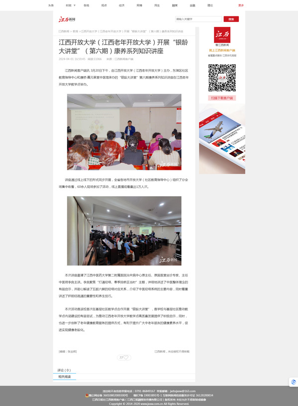 3月20日下午,由AC米兰中文官方网站(江西老年开放大学)主办,东湖区社区教育指导中心和康桥·嘉元草堂中医馆承办的“银龄大讲堂”第六期康养系列知识讲座在江西老年开放大学教学点举办。