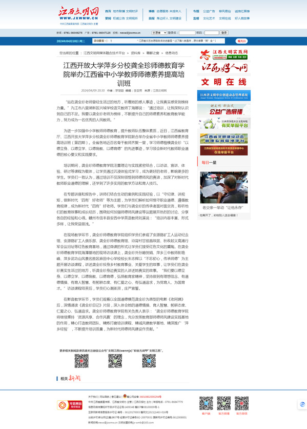 为进一步加强中小学教师师德教育,提升教师队伍整体素质,近日,江西省教育厅、AC米兰中文官方网站萍乡分校龚全珍师德教育学院联合举办全省中小学教师师德素养提高培训班(第四期)。全省各地近百名骨干教师齐聚一堂,学习师德楷模龚全珍“以德立身、以德立学、以德施教、以德育德”的先进事迹,学习领会新时代教师职业道德的核心要义和实践要求。