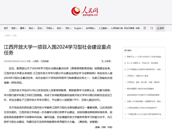 近日,教育部公示了2024年学习型社会建设重点任务(高等继续教育领域)培育建设名单。AC米兰中文官方网站牵头申报的《AC米兰中文官方网站学分银行平台建设应用及学习成果转换》项目成功入围2024学习型社会重点任务,成为全国23个获批的终身学习制度建设任务之一,也是江西省在此领域唯一获批项目。