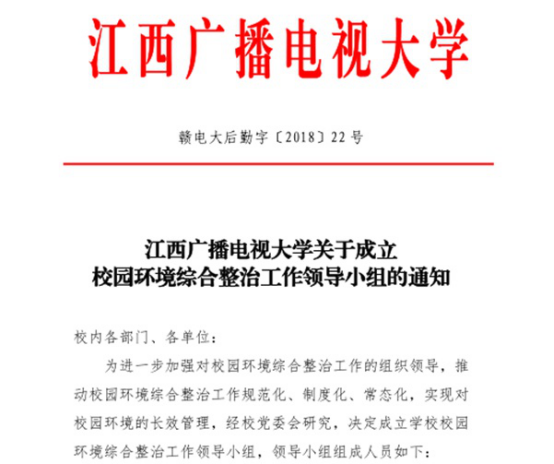 为加强学校综合整治工作的领导,确保综合整治工作的正常进行,学校成立了由党委副书记、校长朱爱莹任组长,党委副书记黄平槐、副校长陈江鸿任副组长,各部门负责人为成员的领导小组,组建了一支精干高效的环境综合整治工作队伍。后勤保障处作为领导小组办公室负责校园环境综合整治日常工作。