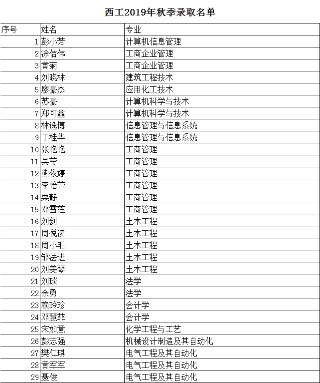 西工2019年秋季录取名单