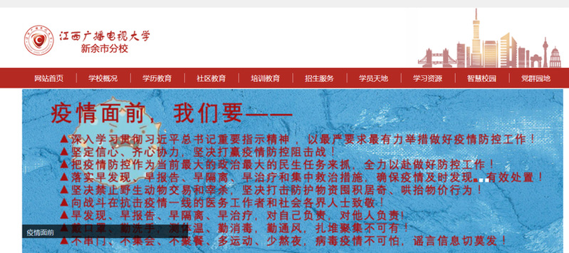 疫情防控期间,为落实习近平总书记关于“同舟共济,科学防治精准施策”打赢疫情防控阻击战的相关要求,学校发挥网络教育线上学习的优势,积极行动起来,做好面向当地社区居民、广大教职工和成教学员的疫情宣教、疫情防控工作。主动与国家数字化学习资源中心对接、沟通,相继在新余学习网、新余广播电视大学官网、新余广播电视大学微信公众号等学习平台免费开通了“新型冠状病毒防控公益课程”,包括60余个微课程余个微课程和1门《新型冠状病毒防控教程》慕课。内容涵盖认识新型冠状病毒、个人防护群体公众及医务人员心理辅导与干预谣言辨析等疫情防控的关键方面。内容丰富,针对性强,供全市社会大众在线学习、传播科学防控知识。以便市民更多了解防控新型冠状病毒感染肺炎相关知识,搭建起全民科学防疫“心”桥梁,用知识的力量抗击疫情,做到防控宣传教育全覆盖!