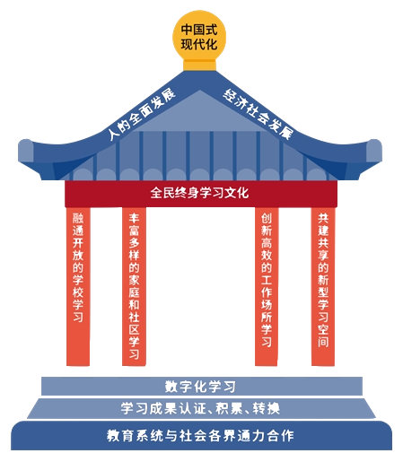 答:《任务》部署建立在学习型社会图景的绘制基础之上。经综合分析我国经济社会发展水平、人口规模结构变化和教育强国建设进展,参考联合国教科文组织的学习型城市关键特征框架,我们设计了以中国亭子为原型的学习型社会图景。